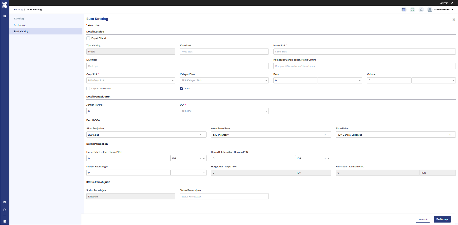 Menampilkan status approval katalog. Status ini menentukan apakah katalog sudah aktif atau belum. - Lokasi Inventaris