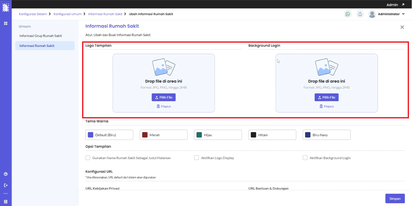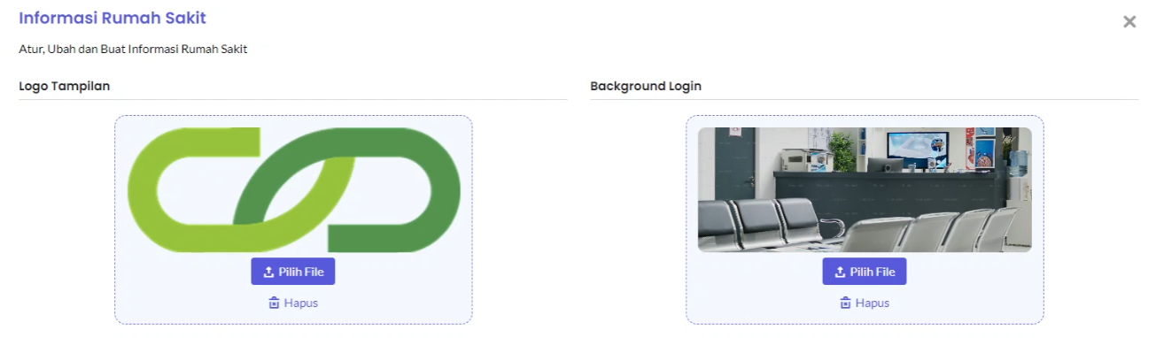 Temukan Kolom Logo dan Background: Di halaman Informasi Rumah Sakit, cari kolom Logo Tampilan dan Background Login.