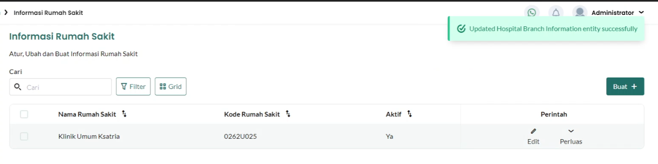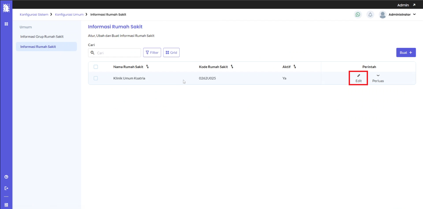 Masuk ke Modul Konfigurasi: Akses menu Konfigurasi > Konfigurasi Umum > Informasi Rumah Sakit, lalu klik Edit.