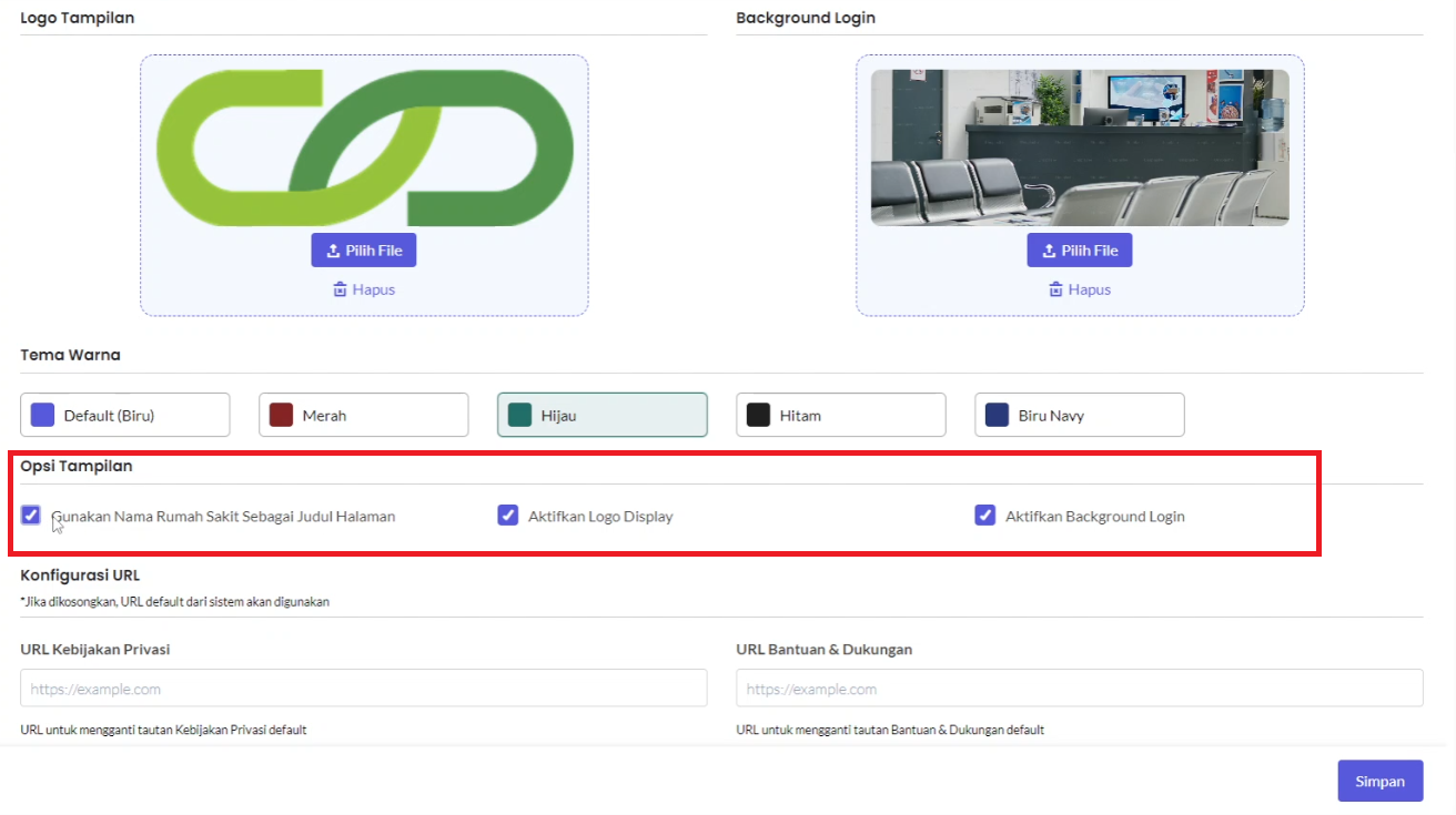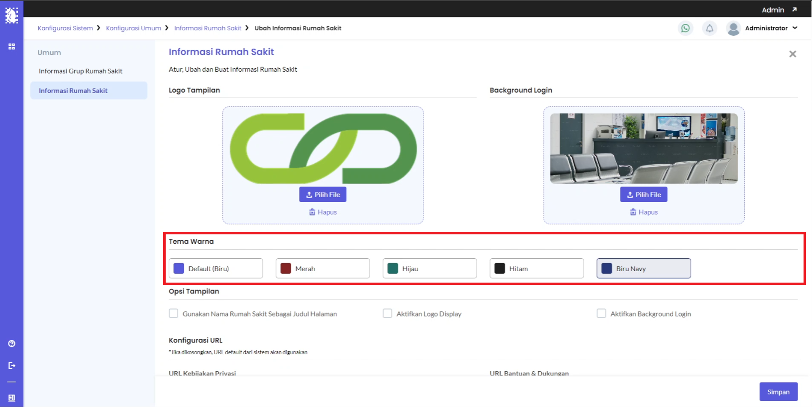 Sesuaikan Tema Warna (Opsional): Anda juga bisa mengganti tema warna dengan mengklik warna yang tersedia sesuai preferensi rumah sakit.