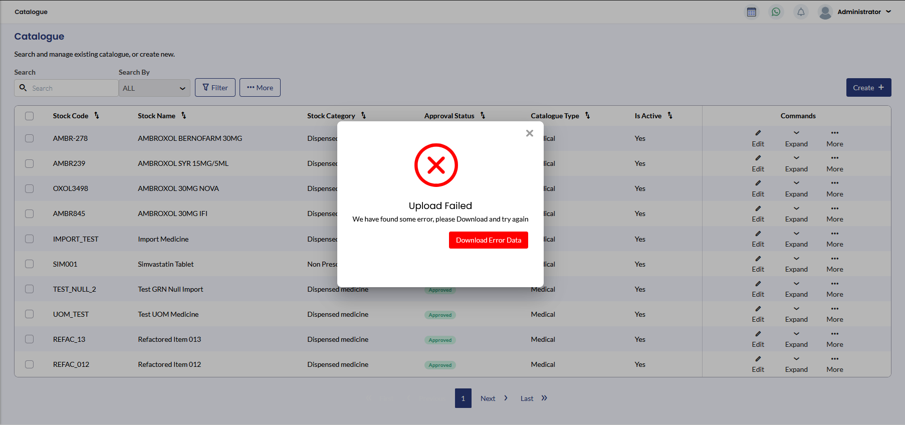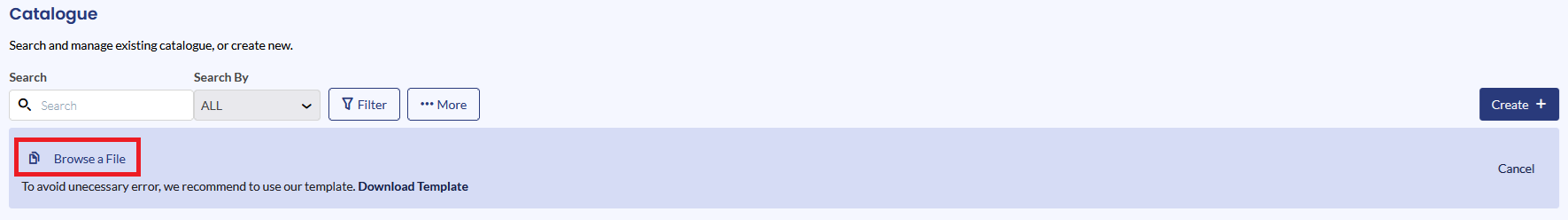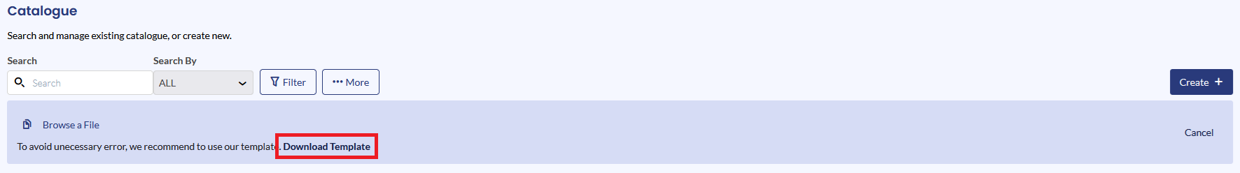 Uploaded catalogue data will appear in the Catalogue table.